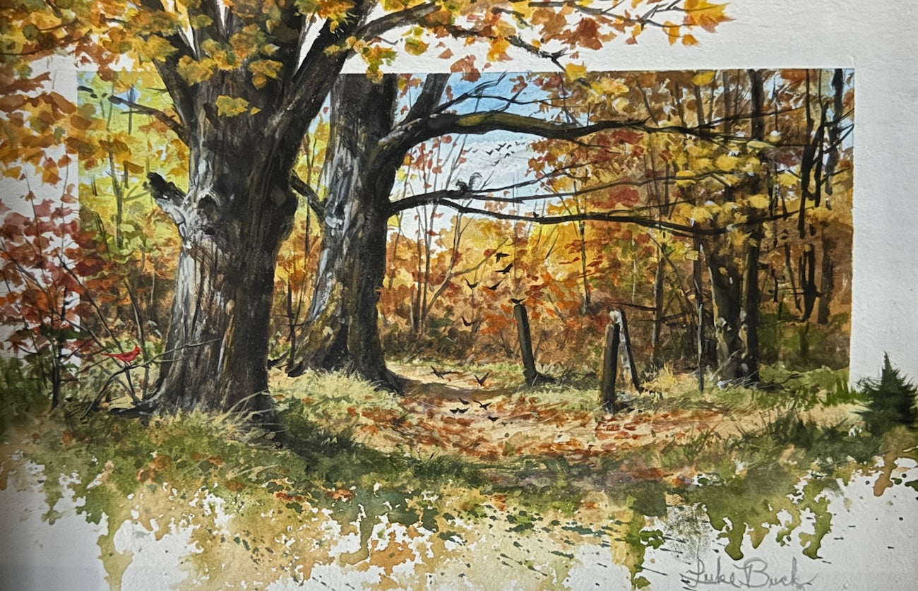 Autumn Path by Luke Buck is an original watercolor and gouache artwork created on archival paper. The painting measures approximately 12 inches wide by 9 inches high, with a framed dimension of 16.25 inches in width and 13.25 inches in height. It is safeguarded with Museum Glass to ensure lasting preservation.